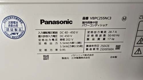 笠岡市中央町 パナソニック パワコンディショナ屋内用集中型VBPC255NC3 パワコン交換工事|岡山で壊れたパワコン交換修理は最短即日対応|岡山パワコン交換ショップ